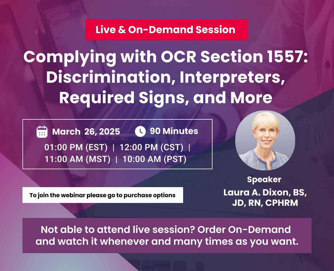 This program will discuss case law regarding several issues important to hospitals and changes by the OCR to comply with these including not requiring hospitals to perform an abortion if against their religious beliefs and issues related to gender.