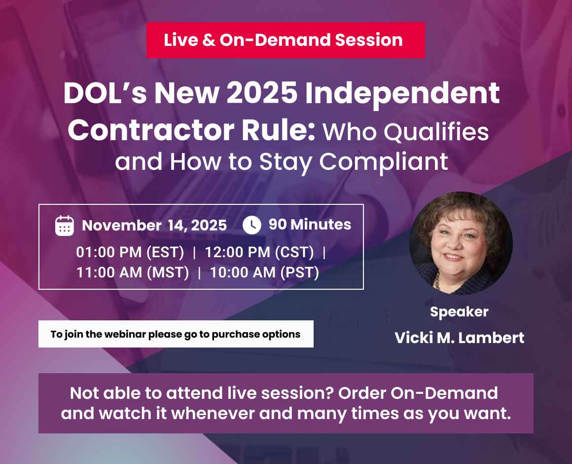 This webinar examines what the requirements are to correctly classify a worker as an independent contractor and also the requirements for when a worker must be classified as an employee.