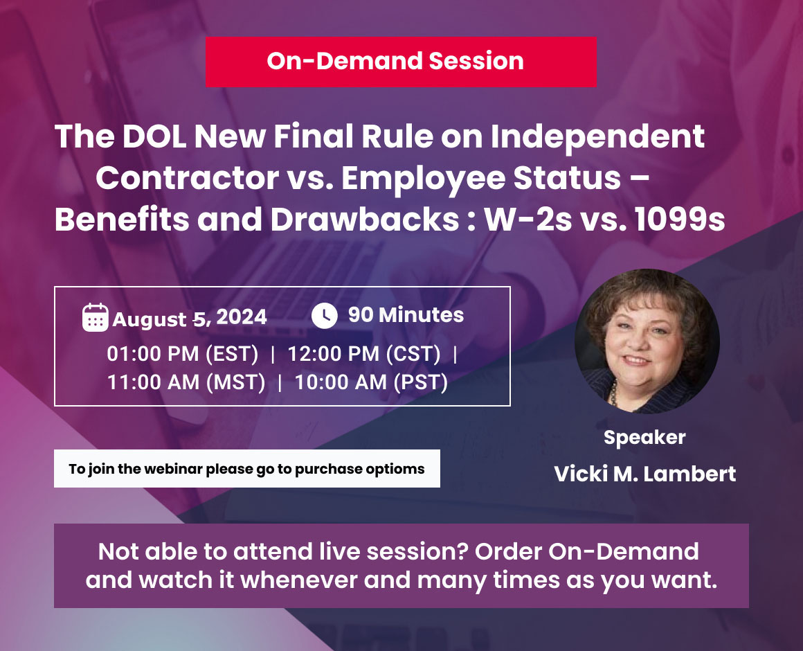This webinar examines DOL’s new Rule, what the requirements are to correctly classify a worker as an independent contractor and also the requirements for when a worker must be classified as an employee.