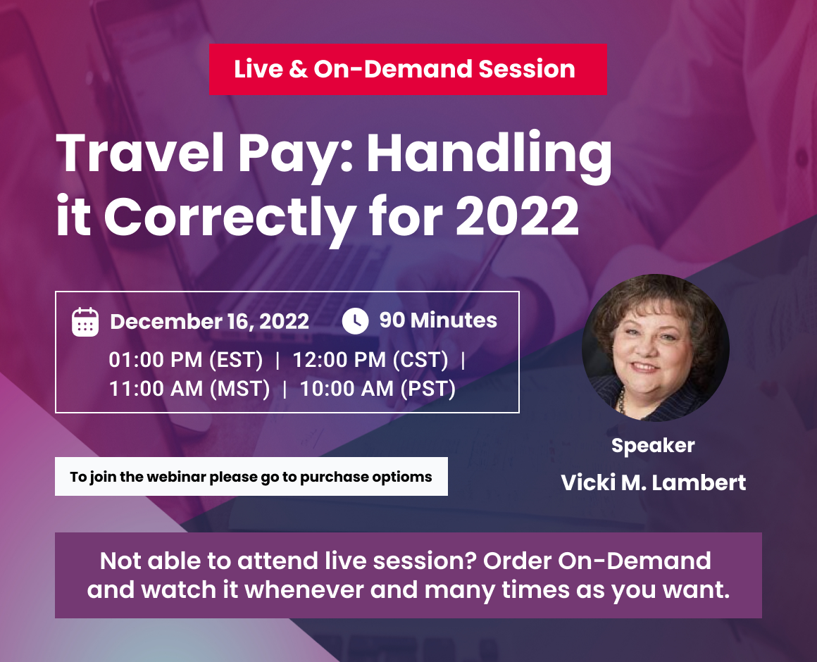 This webinar discusses the rules and regulations that must be followed when paying an employee for travel pay. It includes what is travel pay, best practices for handling the payments, how it affects overtime calculations, and what is required on the state level. It also discusses the requirements for taxing travel expenses under IRS rules.
