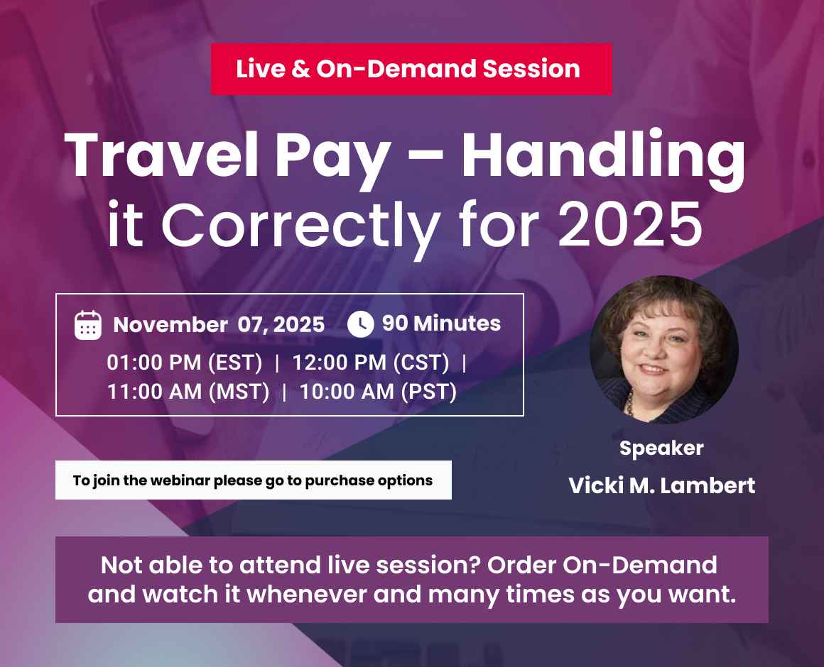 This webinar discusses the rules and regulations that must be followed when paying an employee for travel pay. It includes what is travel pay, best practices for handling the payments, how it affects overtime calculations and what is required on the state level. It also discusses the requirements for taxing travel expenses under IRS rules.