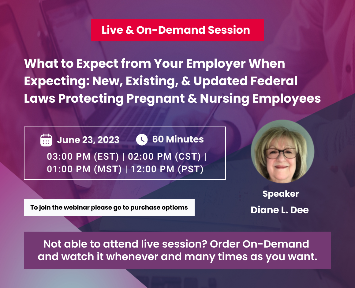 This webinar will provide participants with an overview of current Federal laws addressing pregnancy and will assist participants in gaining a solid understanding of the provisions of The Pregnant Workers Fairness Act and the PUMP for Nursing Mothers Act.  To be in compliance, employers need to understand the provisions of both new laws.